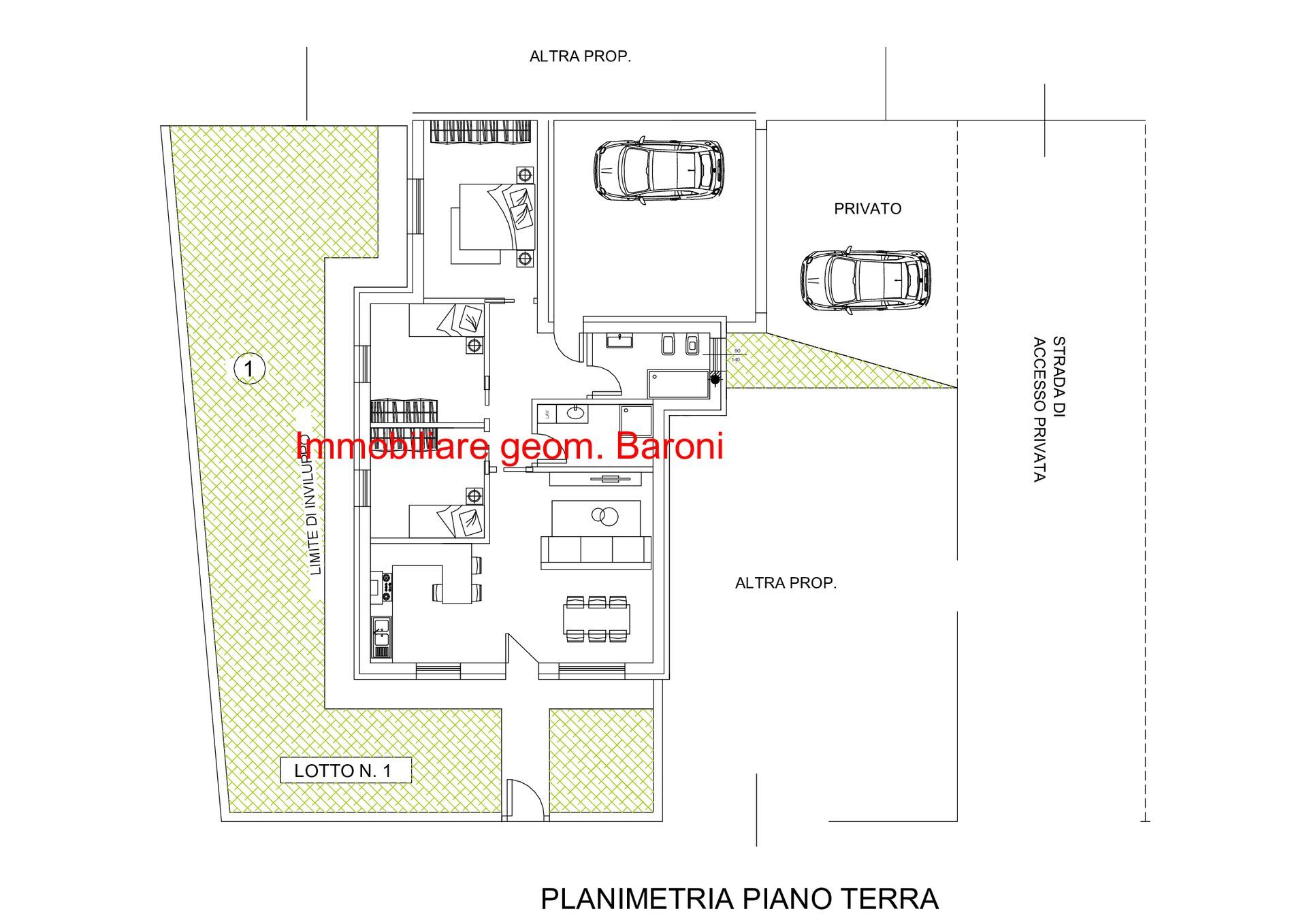 Ingresso pedonale e carrale indipendenti, area di manovra privata, doppia autorimessa in larghezza fuori terra.