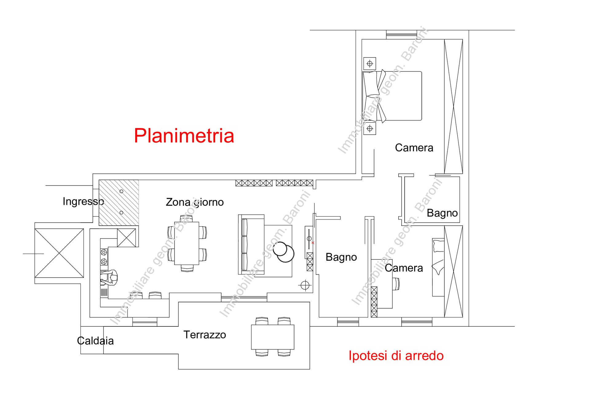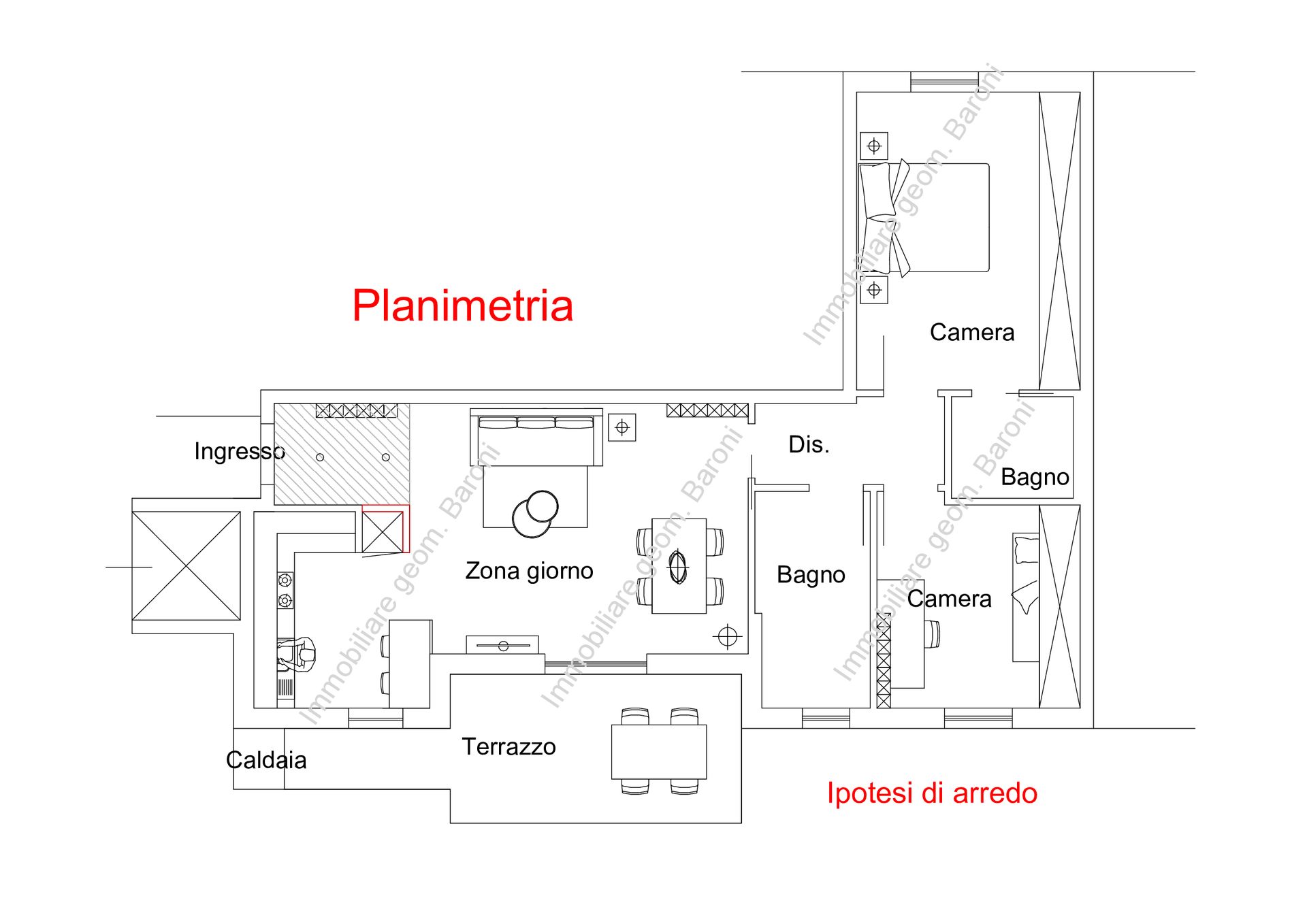 Ingresso, soggiorno, angolo cottura, disimpegno, due bagni (uno accessibile dalla camera più grande) e due camere;